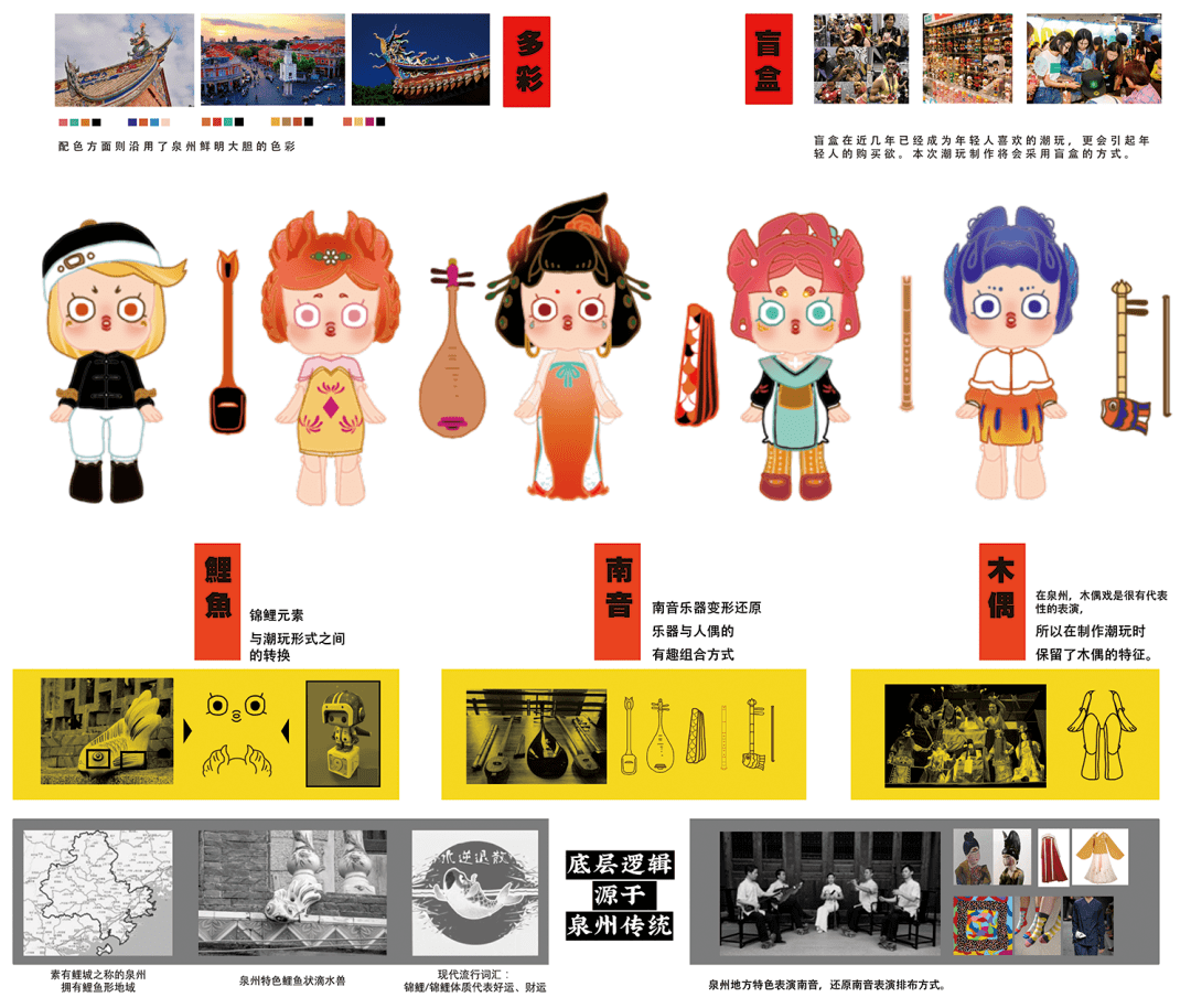 本次潮玩以泉州提线木偶为核心,融合南音和泉州特色滴水兽的锦鲤形象。南音木偶形象辨识度高,符号性强;南音的融入使作品成系列的同时延展性强,引导购买者了解地方文化;鲤鱼不仅具有泉州特色,同时也具有祈福、求好运的寓意。