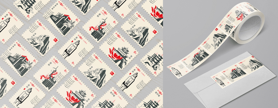 供寄递邮件贴用的邮资凭证,常体现一个国家或地区的历史、科技、经济、文化、风土人情、自然风貌等特色,这让邮票除了邮政价值之外还有收藏价值。作品以邮票为载体,结合当地特色景点进行设计,制作了一套六张的邮集。同时在此基础上对载体进行再设计,创作了手账胶带,丰富邮票纪念品的形式。