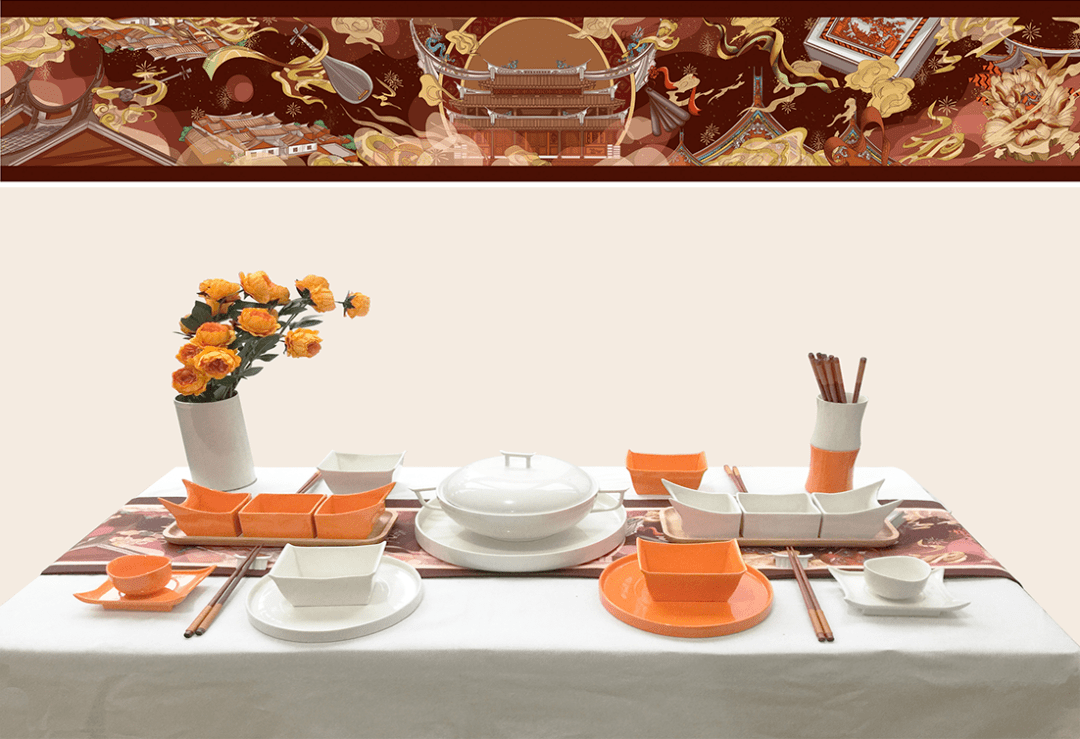 泉州建筑承载着泉州人独特性的闽南地域精神,体现闽南人的审美与精神理想,产品以泉州传统建筑的形态为设计原型。泉州建筑和陶瓷的结合,是文化传播上的一种创新,对于泉州建筑更一种新的推广方式。围绕着泉州地域性建筑而衍生出的灿烂闽南文化为插画主题,运用长图插画的形式来表现应用至桌旗,通过实用产品的文化附加,传承了传统泉州文化,更直观感受到泉州建筑的形态特征。