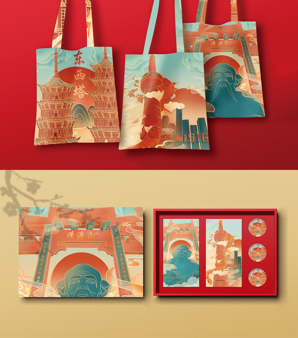 作品中以红色为主色调,进行插画设计和包装设计。在保留了传统新年红的同时加入国潮风格的插画。并将作品应用于春联、红包等新年物件上,还开发了冰箱贴、抱枕、帆布包等物件,为新年营造更浓厚的氛围。