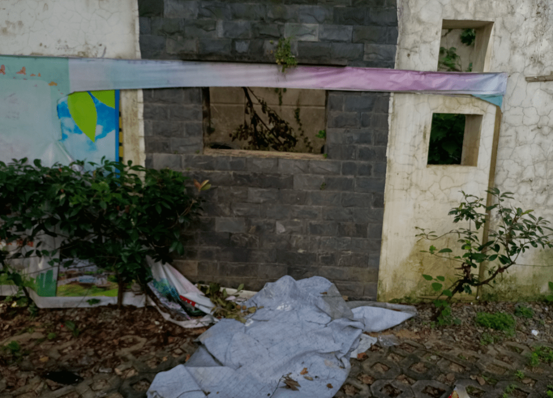 其间一块现已大面积破损,掉落在地面上。不远处的一块“党史学习教育”的公益广告画面中心破了一个洞,周围贴满了通明胶带,有些胶带掉落,公益广告上沾了不少黑色污渍,有碍观瞻。
