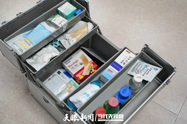 “急救药箱”内包括医用棉签、碘伏消毒液、医用消毒酒精、医用电子体温计、纱布绷带、压敏胶带、一次性屏障消毒面膜、风油精等急救物品。